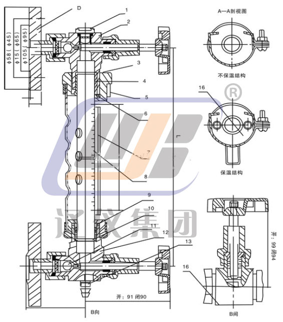 9.壓蓋螺母 10.底環‖ 11.鋼球 12.下閥 13.排污接頭 14.保溫管 15.平焊法蘭 16.標牌